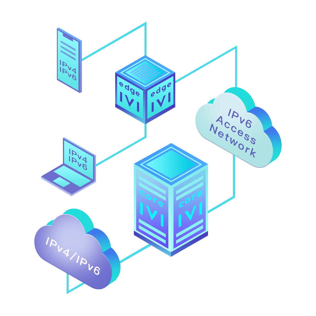 對正在進行IPv6整體升級規劃的運營商,應用IPv6升級方案2.5,通過IVI無狀態翻譯技術和純IPv6接入網絡,為雙棧客戶端和雙棧服務器提供連通服務。